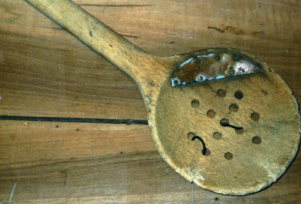 Waschlöffel aus dem 20. Jahrhundert, der mit einem Kupferblech repariert wurde