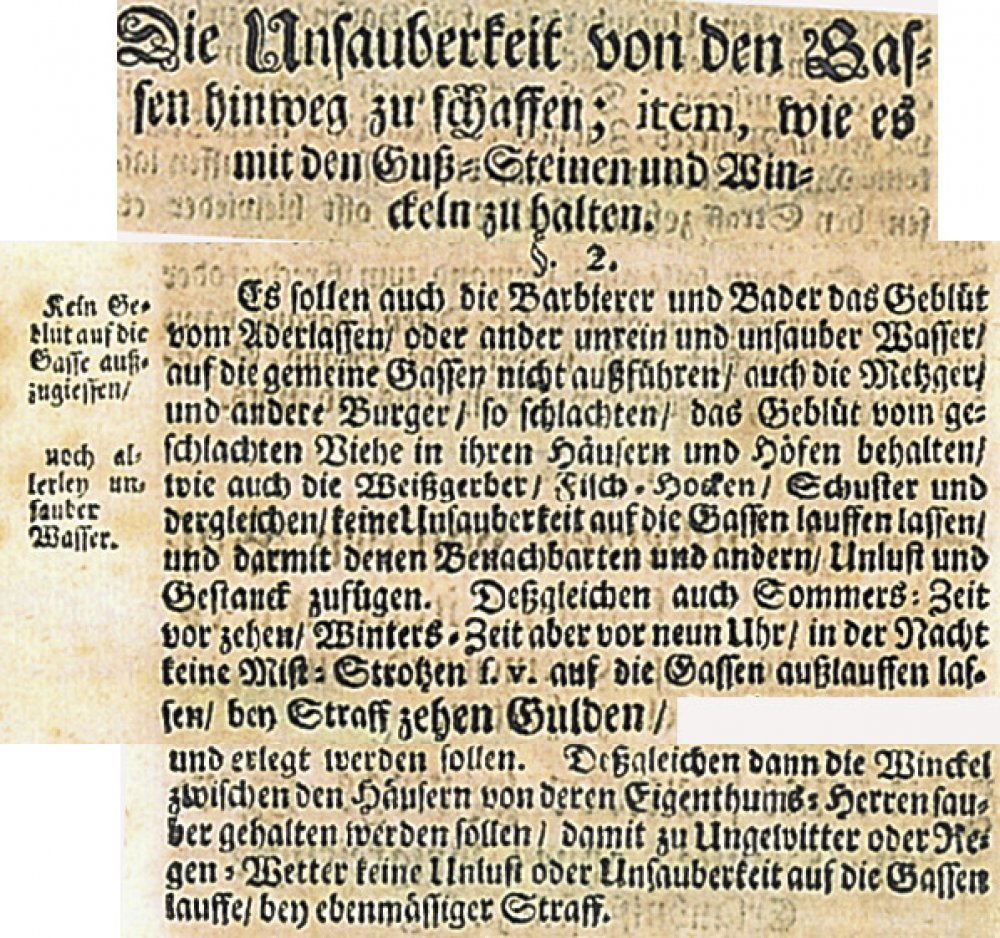 "Kot und Unflat vor den Türen ist binnen drei Tag wegzuführen. Unsaubres aus dem Hause gießen, wird man auch mit Strafe büßen."