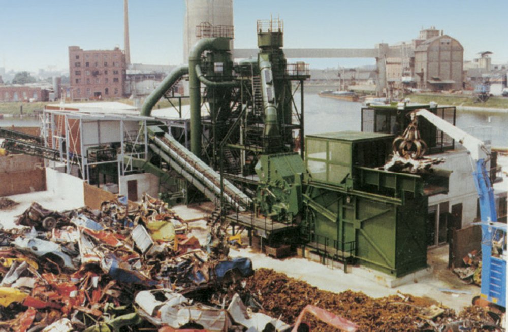 Ein typisches Beispiel für das Recycling von Metallen ist die Wiederverwertung von Autowracks in Shredderanlagen. Die Mühle zerkleinert das Altfahrzeug in faustgroße Stücke.