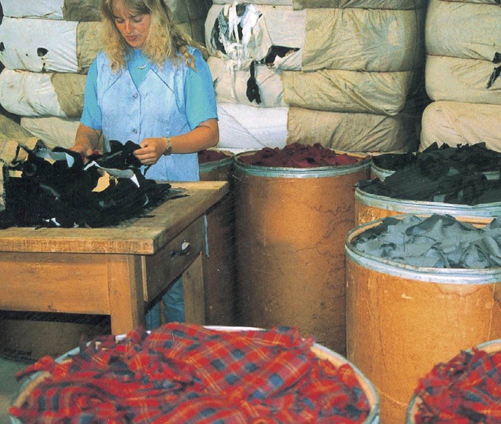 Sortierung von Stoffresten der textilverarbeitenden Industrie für die Neuproduktion von Garn,Firma Westarp, Aschaffenburg