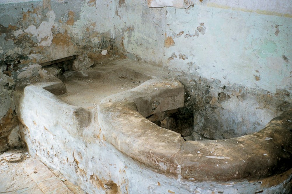 Ausguß-Stein mit Auslauf nach außen im Sackhaus in Schöllkrippen, Landkreis Aschaffenburg
