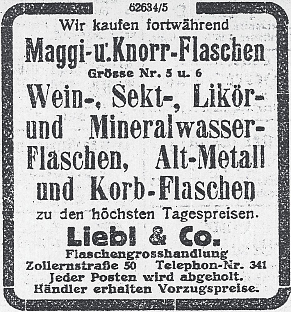 Anzeigentext von 1922 zum Rückkauf von Maggi- und anderen Flaschen