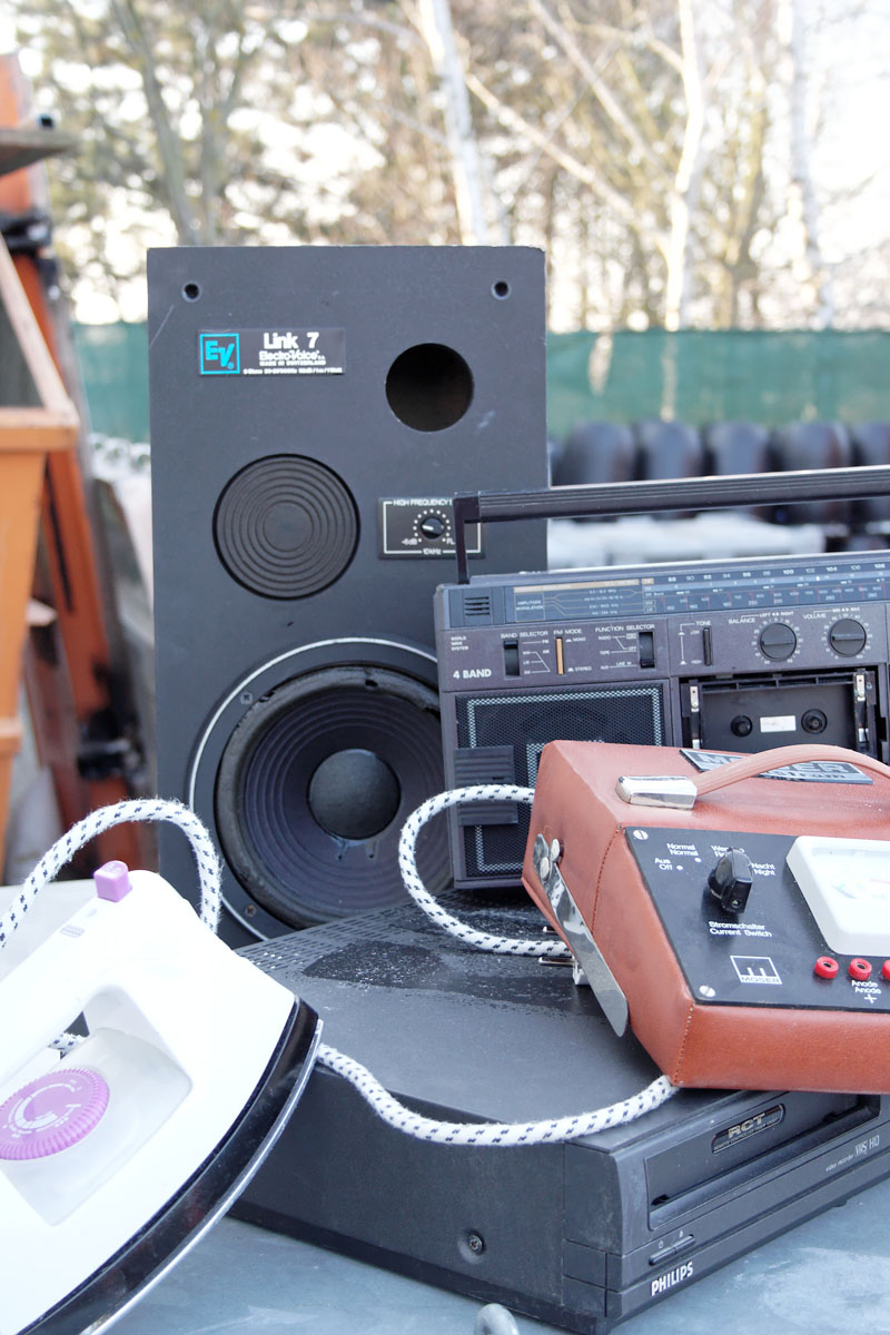 Am Ende nur noch Elektroschrott: Lautsprecherbox, Videorekorder, Radiokassettenrekorder, Bügeleisen und Prüfgerät