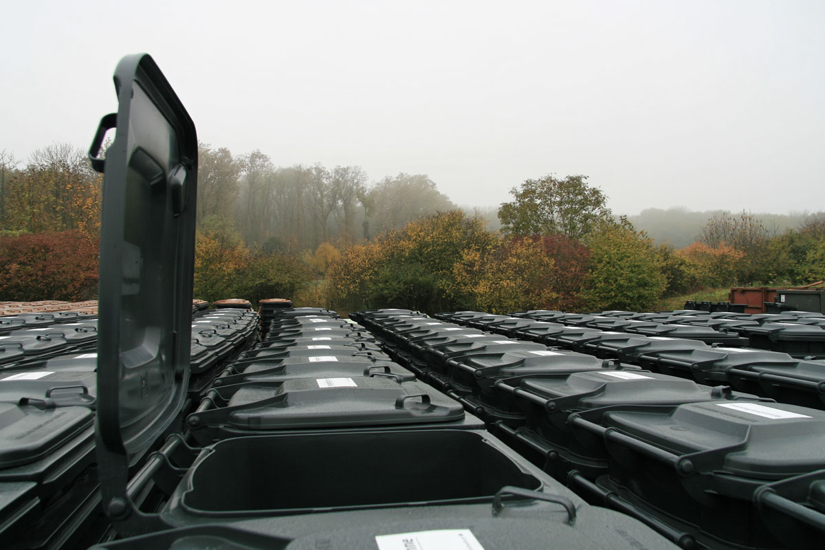 Novemberstimmung und offener Deckel: Graue Restabfalltonnen warten auf ihre Auslieferung an die Kunden