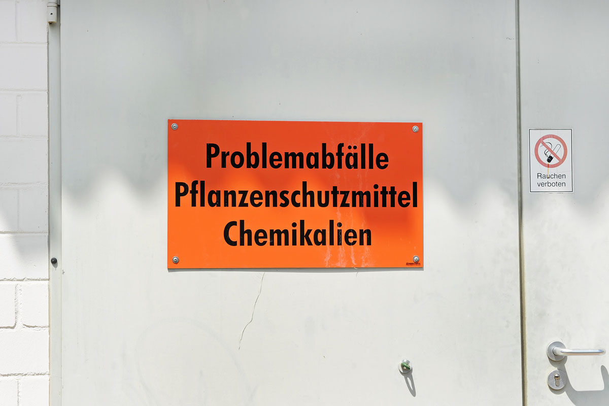 Oranges Hinweisschild an der Tür eines Problemmüll-Zwischenlagers auf einem Wertstoffhof: Problemabfälle, Pflanzenschutzmittel, Chemikalien