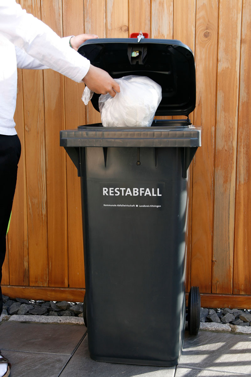 Einwurf von Windeln in eine Windeltonne mit Schwerkraftschloss (120 Liter MGB)
