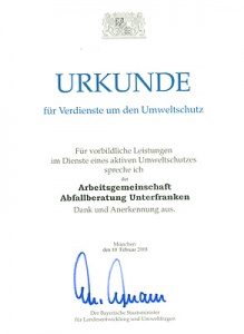Die Urkunde war stellvertretend dem damaligen Sprecher, Jürgen Morlok, übergeben worden. Die «vorbildlichen Leistungen» waren v.a. die Ausstellung zur Geschichte des Abfalls und die branchenspezifischen Entsorgungskonzepte für Gewerbebetriebe.