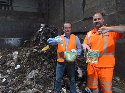Nichts für die Biotonne: Betriebsleiter des Würzburger Kompostwerks, Karl Dormann (l.) und Bernhard Rekrutiuk vom team orange entdecken häufig vermeidbare Fehlwürfe im angelieferten Bioabfall.