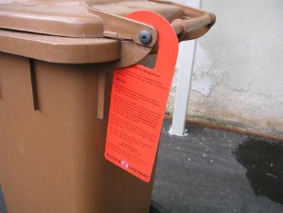 Ist ab dem 09.11.2009 eine Biotonne falsch befüllt und der Detektor schlägt an, erhält der Kunde zukünftig eine „Rote Karte" und die Biotonne bleibt ungeleert stehen. Die Karte hängt der Müllwerker an den Deckel der Biotonne.