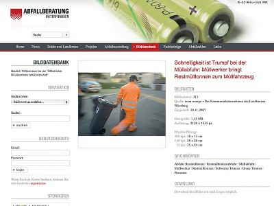 Äußerst beliebt ist die integrierte Bilddatenbank, die inzwischen mehr als 500 Fotos aus den verschiedensten Themenbereichen der Abfallwirtschaft zum kostenlosen Download anbietet. 169 Nutzer sind aktuell registriert, die bis dato fast 2.000 Bilder heruntergeladen haben. Favoriten sind dabei Motive zur Müllabfuhr, zu den verschiedenen Abfallarten und nicht zuletzt auch historisches Bildmaterial.
