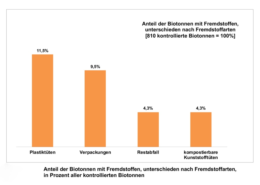 Als Störstoff Nummer eins wurden erneut Plastiktüten identifiziert. Sie waren in fast zwölf Prozent der kontrollierten Abfallbehälter zu finden. Aus falschen hygienischen Erwägungen heraus werden noch immer zu häufig organische Abfälle in einer Plastiktüte verpackt. «Die deutlichste Verbesserung gegenüber den letzten Kontrollen gab es bei den Sammelbeuteln aus biologisch abbaubaren Kunststoffen», so Gutachterin Hoeß. Sie waren dieses Mal lediglich in vier Prozent der untersuchten Biotonnen anzutreffen.