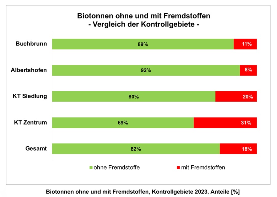 Grafik 1: Biotonnen ohne und mit Fremdstoffen, Kontrollgebiete 2023, Anteile [%]