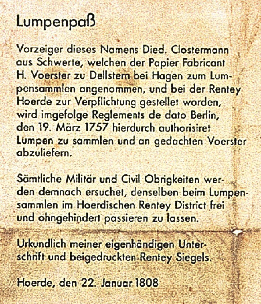Trotz aller Regelungen zum Lumpensammeln und Lumpen- handel konnte der Rohstoffbedarf zur Papierherstellung kaum gedeckt werden.