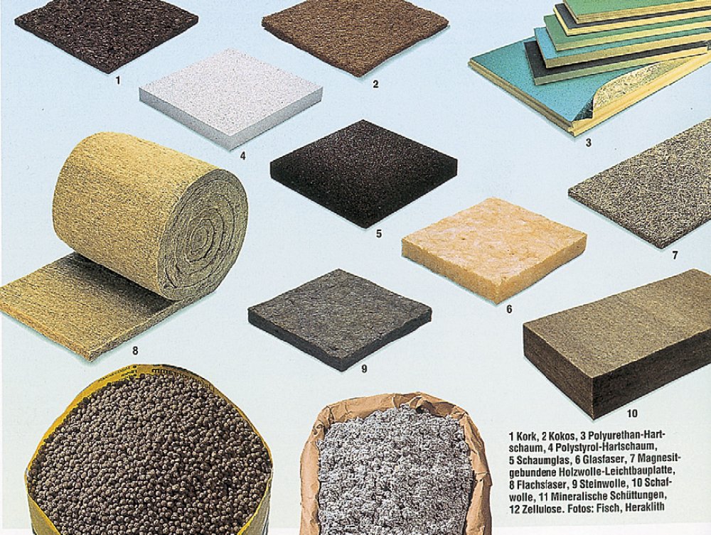 Konventionelle und alternative Dämmstoffe: 1 Kork, 2 Kokos, 3 Polyurethan-Hartschaum, 4 Polystyrol-Hartschaum, 5 Schaumglas, 6 Glasfaser, 7 Magnesit gebundene Holzwolle-Leichtbauplatte, 8 Flachsfaser, 9 Steinwolle, 10 Schafwolle, 11 Mineralische Schüttungen, 12 Zellulose