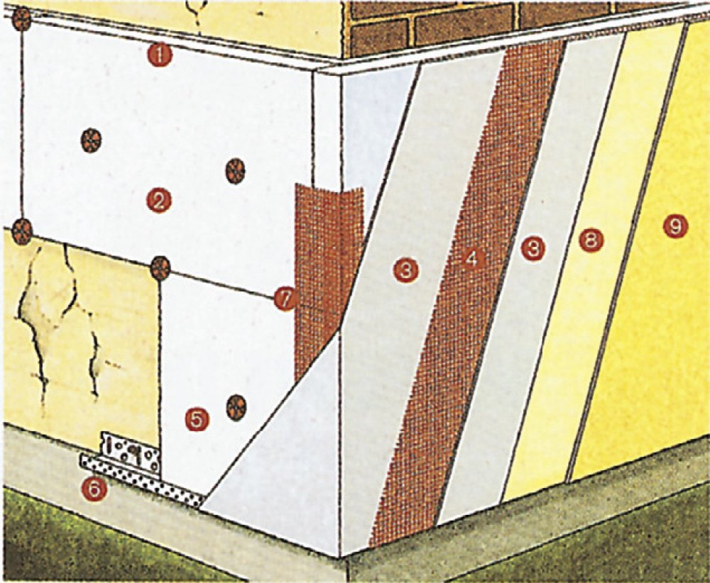 Wärmedämm-Verbundsystem: 1. Klebemasse, 2. Dämmplatten, 3. Armierungsmasse, 4. Armierungsgewebe, 5. Dübel, 6. Sockelabschluß, 7. Eckverstärkung, 8. Zwischenanstrich, 9. Putzbeschichtung